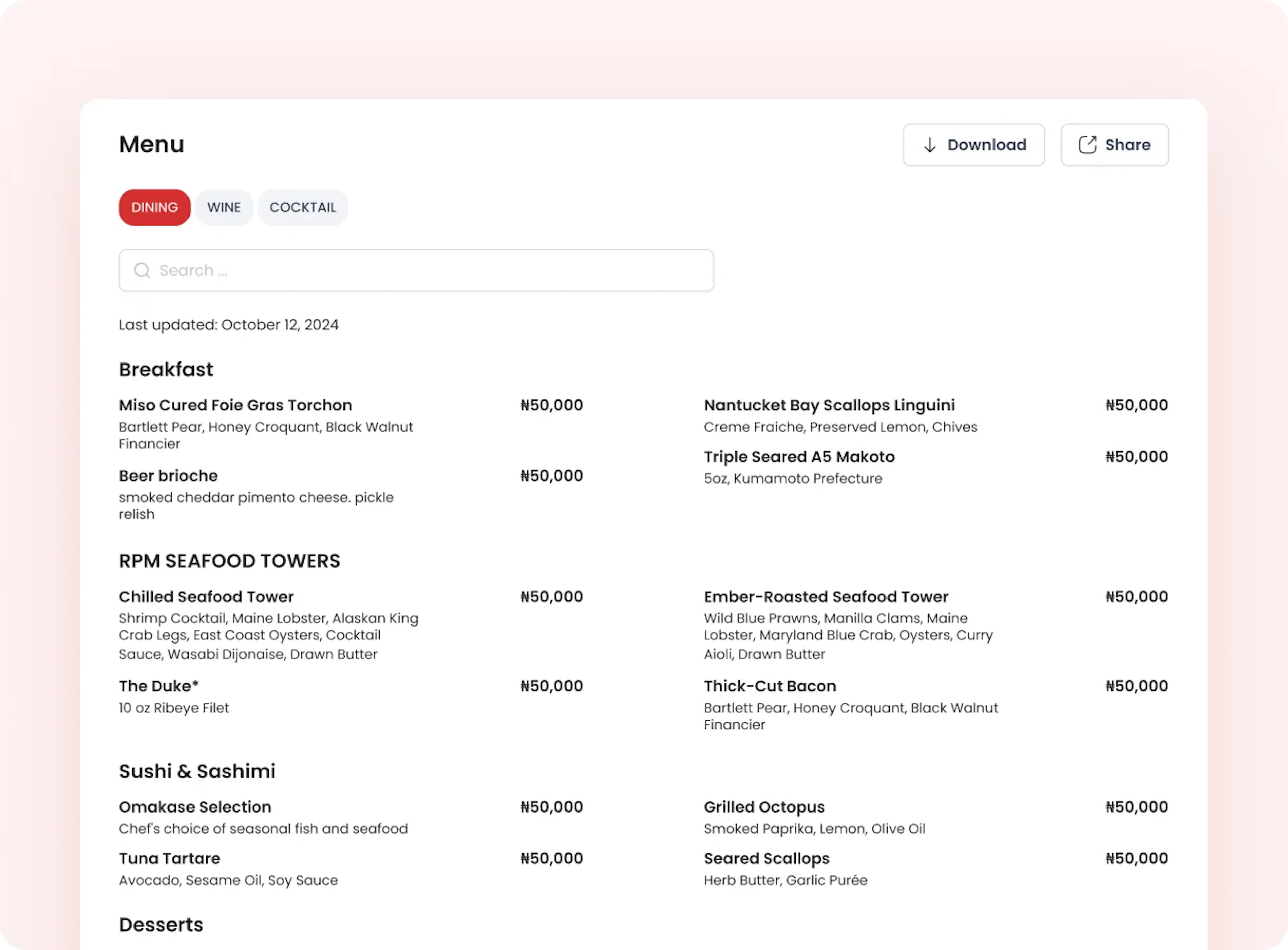 When something changes, your menu should reflect it immediately. FlavorQueste lets you update dishes, prices, and availability in real time, so your team is always working with accurate information.